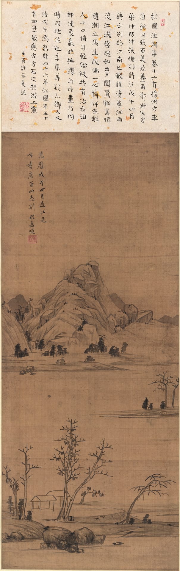 程嘉燧(1565~1643),明代书画家、诗人。字孟阳,号松圆、偈庵,又号松圆老人、松圆道人、偈庵居士、偈庵老人、偈庵道人。晚年皈依佛教,释名海能。精音律,工山水,画学倪瓒、黄公望,笔墨枯淡,意境萧索。尤长于诗,世称为松圆诗老。画花卉沉静恬淡,格韵并胜,笔墨枯淡,偏于闲静。与李永昌属天都派,亦为新安派先驱。