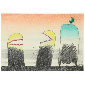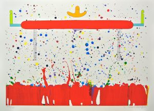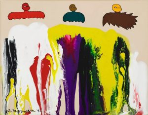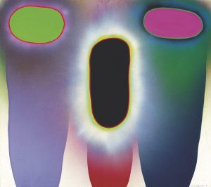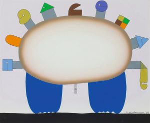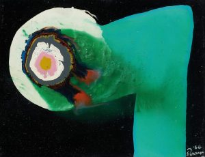 元永定正 1922 – 2011 ,生于日本三重县,日本「具体美术协会」一员。不同于当时在日本战后盛行的超现实主义与存在主义的画风,在60年代元永定正在美国所创作的抽象绘画色彩变得明亮并带有圆形组合;他把自己幽默的称为「傻瓜派」,把自己的作品叫做「滑稽艺术」。